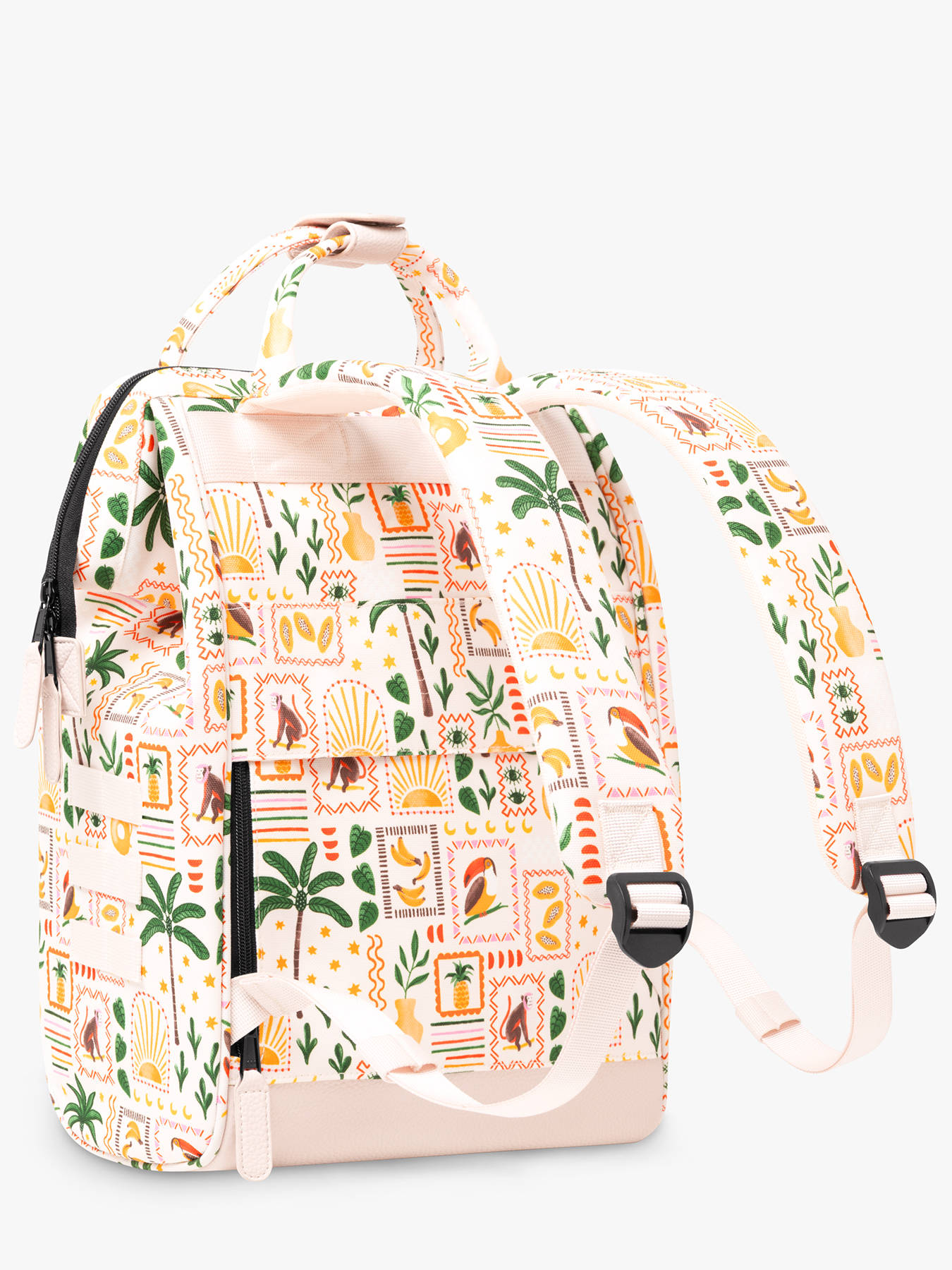 Ga voor vegan met deze Cabaia rugzak! Deze rugzak uit de ""Around the World"" collectie is je ideale metgezel, zowel voor school als voor op reis. Een leuk extraatje is het afneembare voorvakje, zo kan je de rugzak aan je outfit of stemming aanpassen en personaliseren. Deze rugzak is gemaakt van ultrabestendig nylon en heeft een groothoekopening die toegang biedt tot een ruim hoofdcompartiment voor een 13"" laptop of tablet. U kunt er ook schriften en mappen van A4-formaat in opbergen. Deze rugzak is ook perfect voor het meenemen van kleding tijdens een weekendje weg, met ruimte voor 2 jeans, 1 trui, 2 T-shirt, ondergoed, een toilettas, een computer en een tablet. Voor maximaal comfort is de rugzijde verstevigd en zijn de schouderbanden gewatteerd. Aan de achterkant van de tas is een extra ritsvakje voor kleine spulletjes te vinden. De verwisselbare voorvakjes worden samen met de rugzak geleverd.