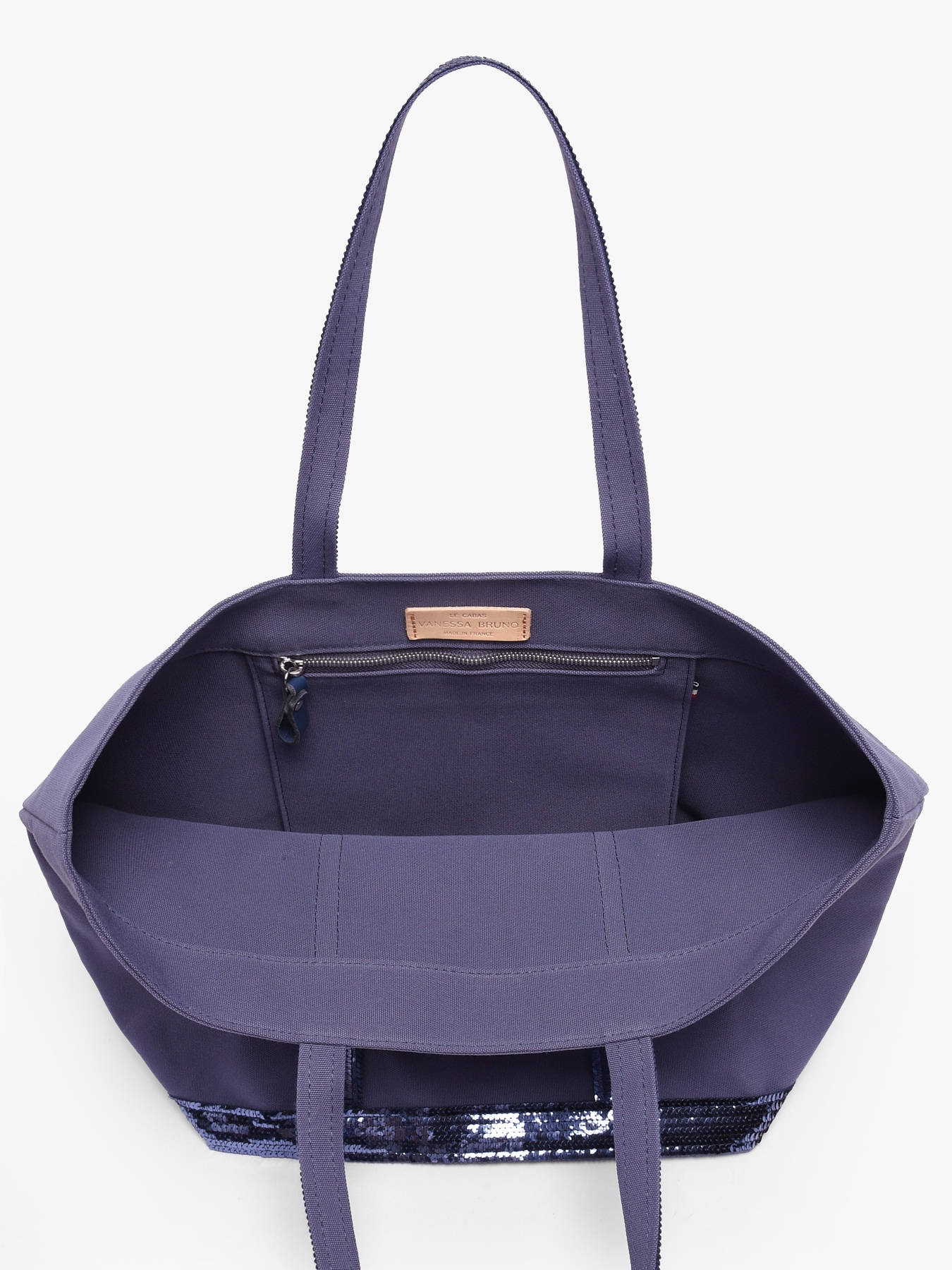Ontdek hier het nieuwe Le Cabas model van het Franse topmerk Vanessa Bruno, gemaakt van een zeer resistent katoen en afgewerkt met glinsterende pailletten. Dit ""Medium ++"" model kan ook gebruikt worden als schooltas of om te gaan werken. Draag deze Vanessa Bruno tas in de hand of op de schouder, aan jou de keuze! Binnenin is een ritsvakje voorzien voor kleinere essentials. Op het etiket binnenin staat volgende opdruk: ""Le Cabas Vanessa Bruno Made in France"".